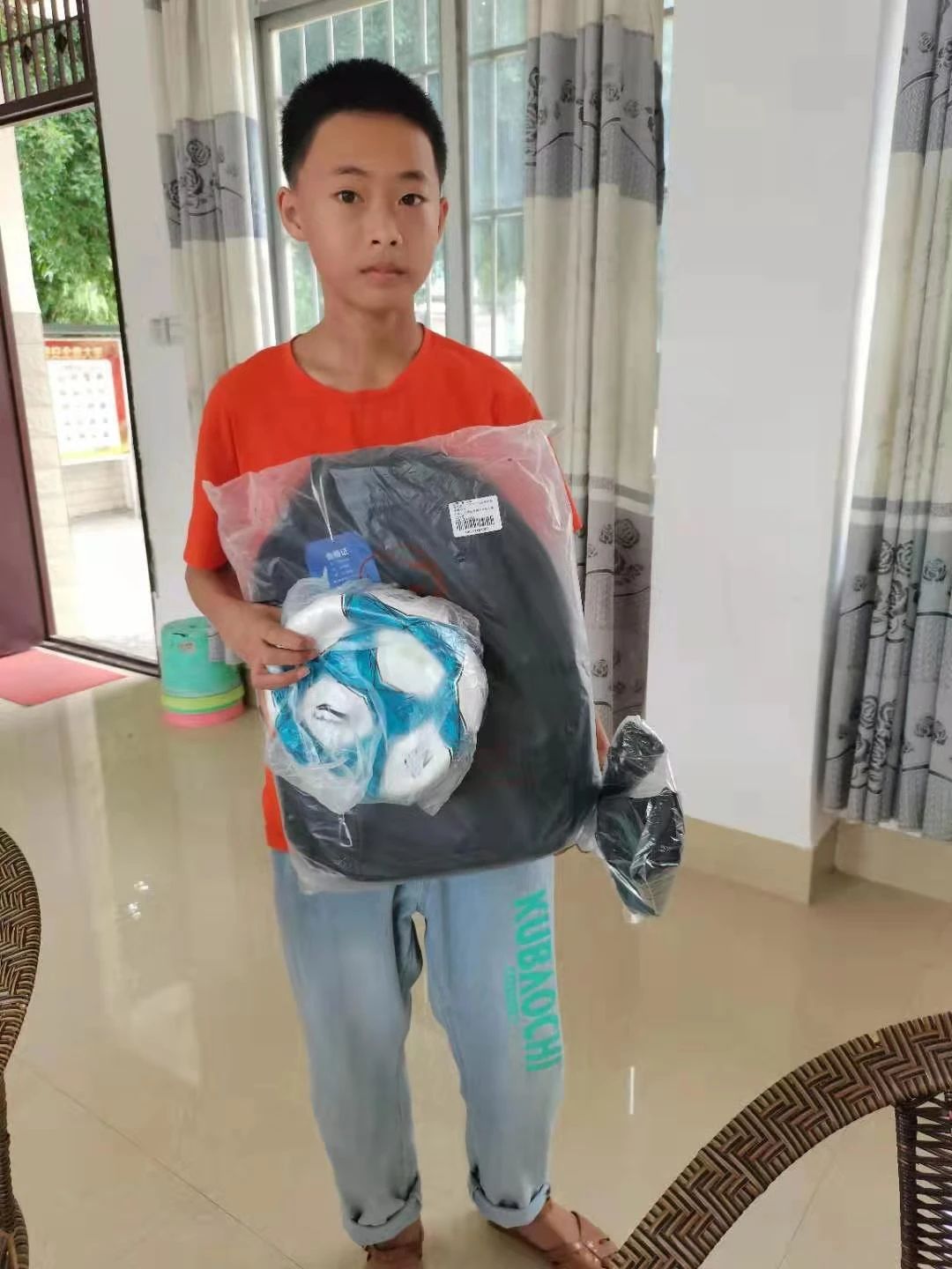 他們三人資助的學生即將升入初中。為慶祝他們小學畢業,他們專門給孩子郵寄了足球、衣服、書包等物品。