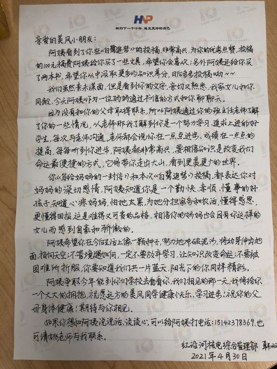 隨圖書一同郵寄的還有幾封特殊的信件。這是綜合黨支部黨員楊毅、韓雙、王迎芬寫給受資助學生的信。三年多前,他們就和這個學校的孩子們建立了聯系,了解孩子的學習、生活近況,為孩子購買學習用品和衣物等物資,鼓勵他們克服困難,把學習搞好,樂觀面對生活。