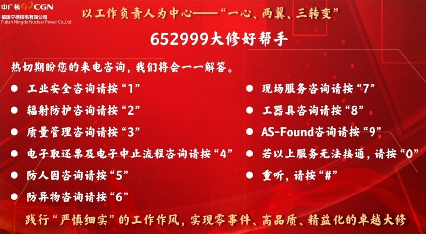 寧德核電開通“652999大修好幫手”一鍵式服務(wù),由10余個(gè)專業(yè)組成的“客服”團(tuán)隊(duì)在大修期間24小時(shí)在線提供服務(wù)。在近期多個(gè)大修共提供電話服務(wù)502次、解決現(xiàn)場(chǎng)問題622項(xiàng)。隨后,又開通“123”照明服務(wù)熱線,至今已收到并解決73條缺陷,有效提升現(xiàn)場(chǎng)照明消缺響應(yīng)速度。