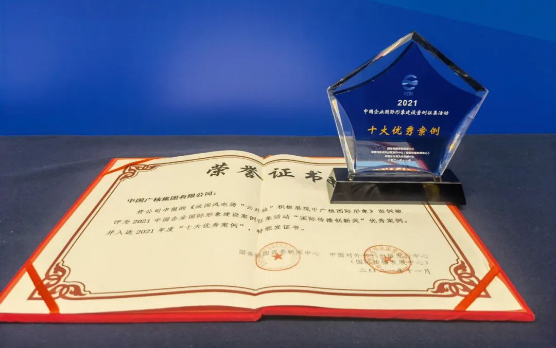 論壇以“推進可持續發展 共建美好世界”為主題,發布了《中國企業形象全球調查報告2021》以及“可持續品牌全球傳播”計劃,揭曉了2021中國企業國際形象建設案例征集評選結果。中國廣核集團(簡稱“中廣核”)申報的《法國風電場“云開放”積極展現中廣核國際形象》案例,被評為2021中國企業國際形象建設案例“國際傳播創新類”優秀案例,并入選2021年度“十大優秀案例”。同時獲得“十大優秀案例”還有東方航空、中國建筑、三峽集團、中國航天科技、中國華電科工、北京同仁堂、國家電網、中國石化、中國生物技術等單位。