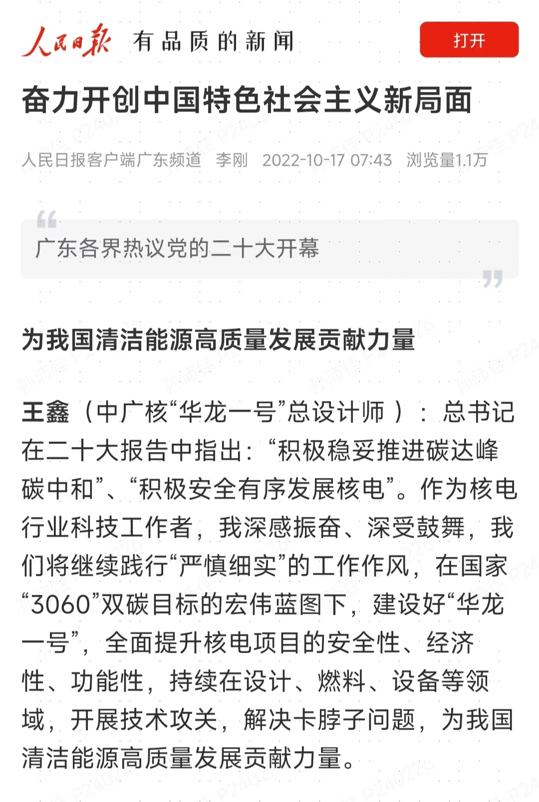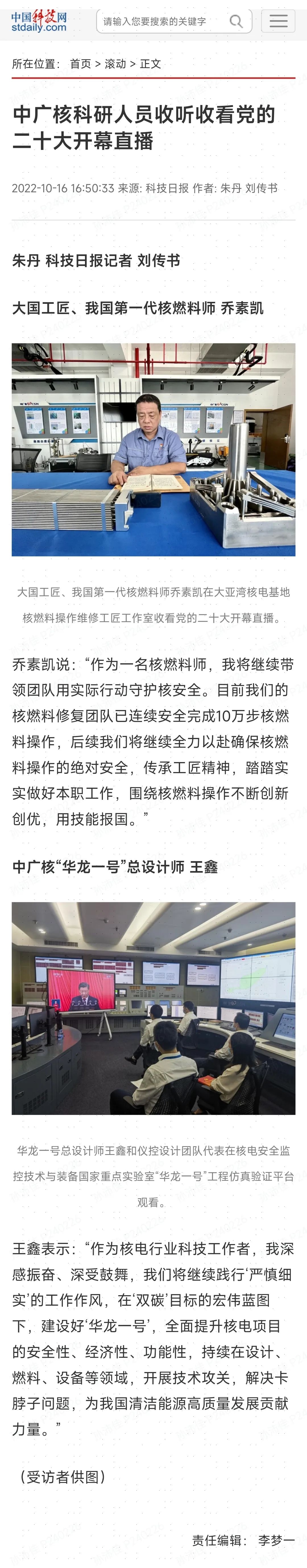習近平總書記的報告里提到“一些關鍵核心技術實現突破,戰略性新興產業發展壯大,載人航天、探月探火、深海深地探測、超級計算機、衛星導航、量子信息、核電技術、大飛機制造、生物醫藥等取得重大成果”,這令我倍受鼓舞。作為一名核電工作者,我要堅持守正創新,堅持問題導向,守護好核安全,積極參與核電領域重大技術攻堅戰,以“釘釘子”的精神潛心鉆研燃料組件檢測等新技術難題,不斷提出新方案、新方法,努力為中廣核核電事業踏上新征程、開創新局面作出更大貢獻。