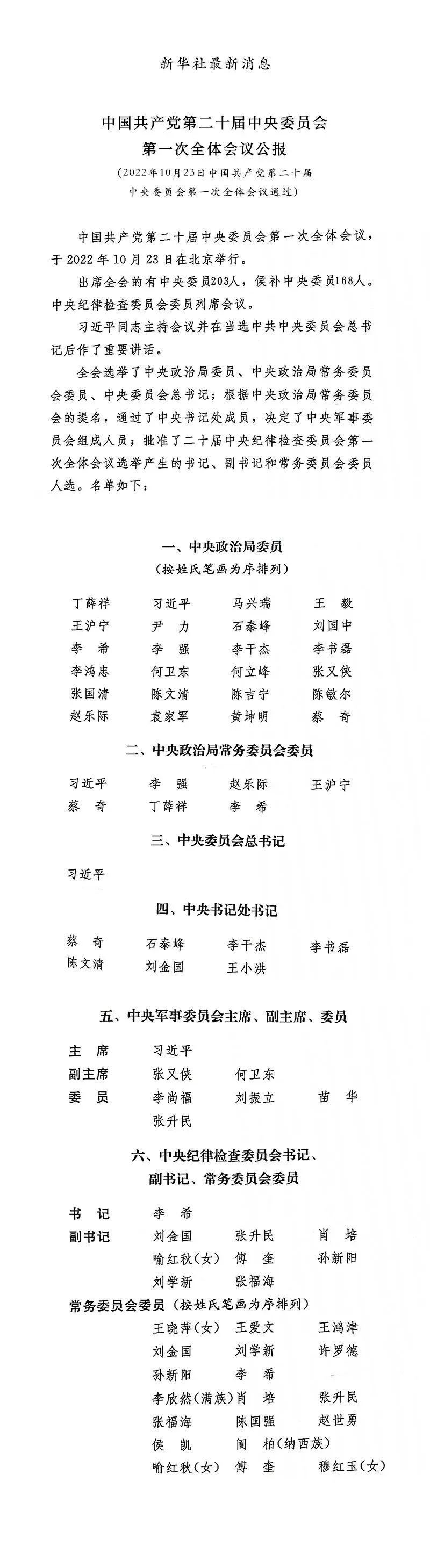 中國共產(chǎn)黨第二十屆中央委員會(huì)委員名單
