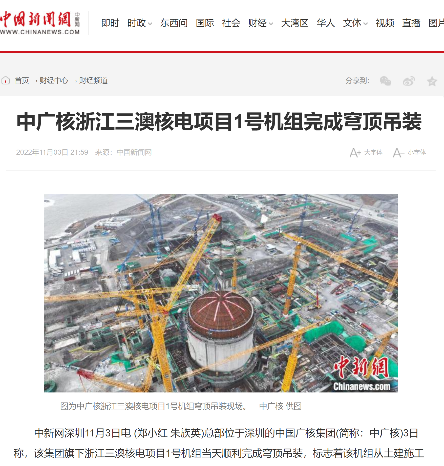 人民日報(bào)、新華社、央視等媒體聚焦報(bào)道中廣核浙江三澳核電項(xiàng)目1號機(jī)組完成穹頂?shù)跹b