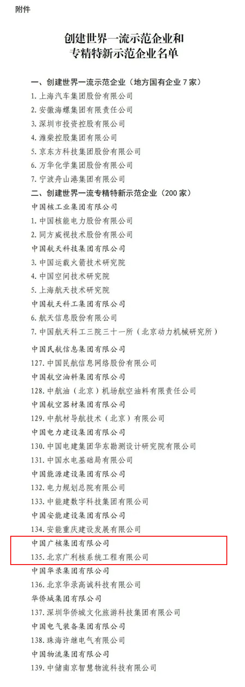 近日,國務(wù)院國資委印發(fā)《創(chuàng)建世界一流示范企業(yè)和專精特新示范企業(yè)名單》,中國廣核集團下屬北京廣利核系統(tǒng)工程有限公司入選該名單,成為全國200家創(chuàng)建世界一流專精特新示范企業(yè)之一。