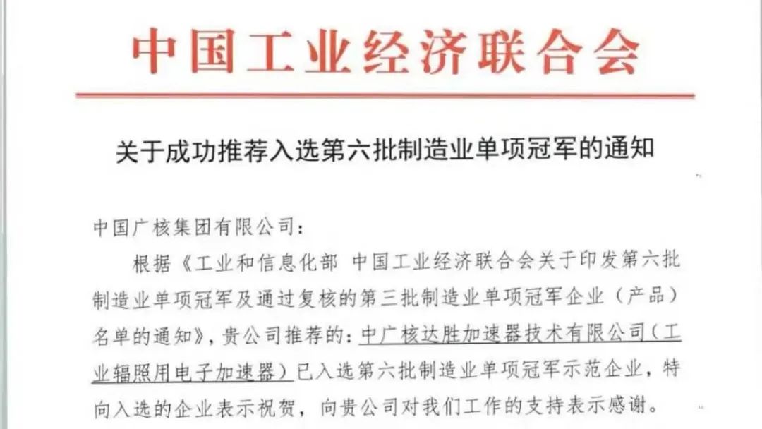 2019年和2021年,北京廣利核系統(tǒng)工程有限公司、中廣核達勝加速器技術(shù)有限公司分別憑借主營產(chǎn)品——核電站數(shù)字化控制保護系統(tǒng)和電子加速器,成功入選工信部認(rèn)定的制造業(yè)單項冠軍示范企業(yè),該稱號被譽為“制造業(yè)皇冠上的明珠”。該項評選旨在引導(dǎo)企業(yè)專注細分產(chǎn)品領(lǐng)域的創(chuàng)新、產(chǎn)品質(zhì)量提升和品牌建設(shè),突破關(guān)鍵領(lǐng)域短板,培育具有全球競爭力的世界一流企業(yè)。