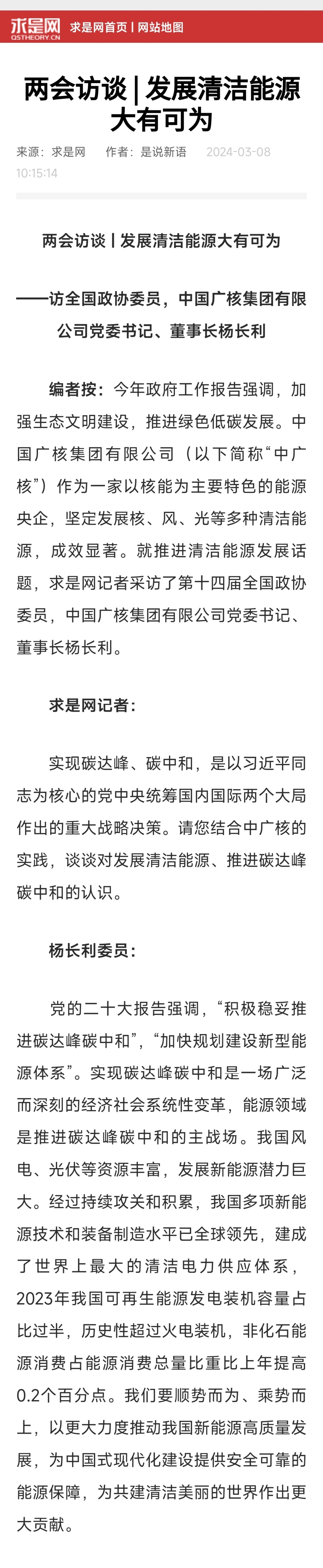 兩會訪談 | 發展清潔能源大有可為——訪全國政協委員,中國廣核集團有限公司黨委書記、董事長楊長利