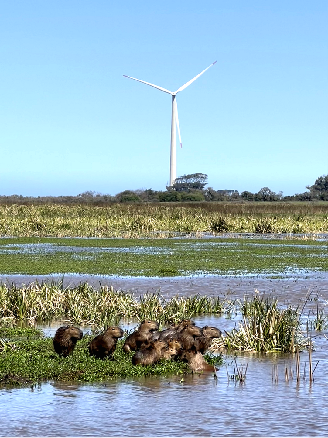 隨后,在中廣核巴西能源有限公司環境工程師瑪亞拉·路易莎的帶領下,孩子們探訪了SVP風電場的生態走廊保護區,并在這里幸運地“邂逅”了風場“常住動物居民”——紅腹蟾蜍和巴西水豚。這條生態走廊位于曼蓋拉潟湖濕地帶,沿著SVP風電場延伸超過18公里,開闊地帶寬達2公里,是該區域野生物種的重要棲息地。“目前,我們在風電場里已監測并識別出300多種野生動物,其中有9種瀕臨滅絕的野生動物,包括紅腹蟾蜍、絕色澳小鳉、橙頭黑鸝等。”瑪亞拉為孩子們介紹。