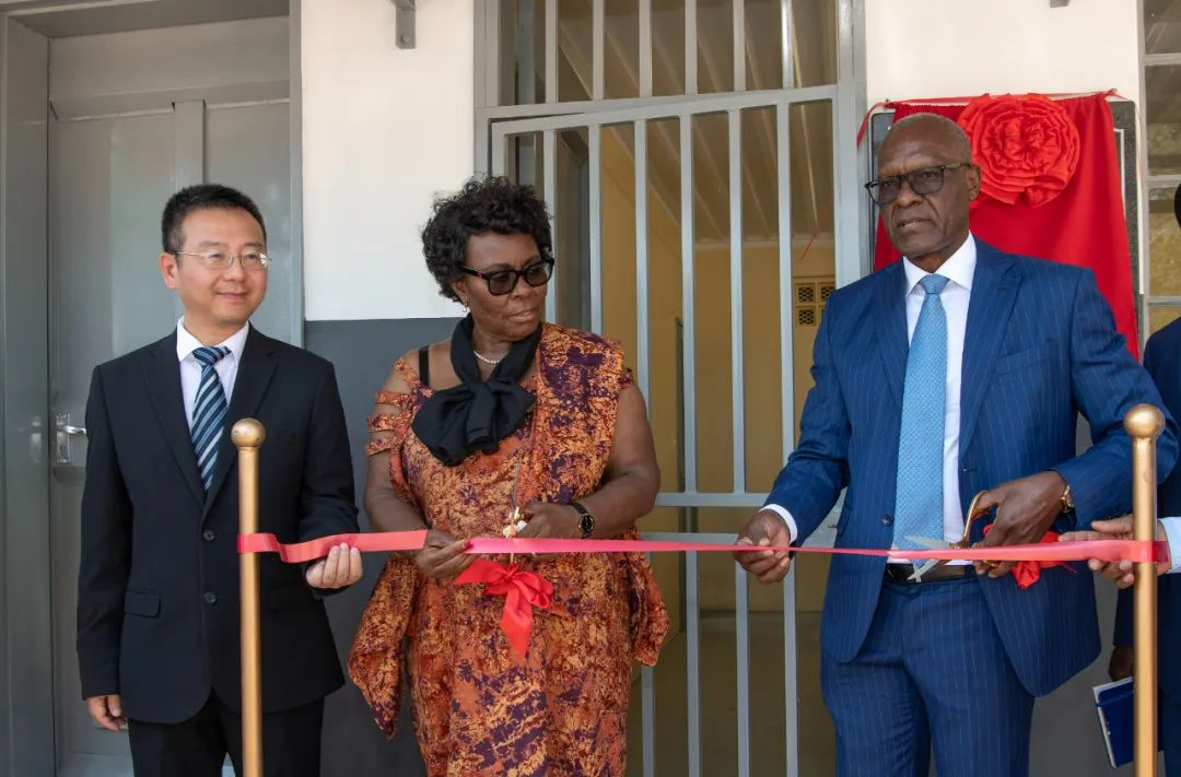 ▲2024年10月4日,在納米比亞北部奧漢圭納省拉扎盧斯豪菲庫(kù)聯(lián)合學(xué)校,納教育、文化和藝術(shù)部部長(zhǎng)Ester Anna Nghipondoka(中)、納礦能部部長(zhǎng)Tom Alweendo(右)、斯科公司總經(jīng)理邱斌(左)為該校首個(gè)計(jì)算機(jī)房剪彩