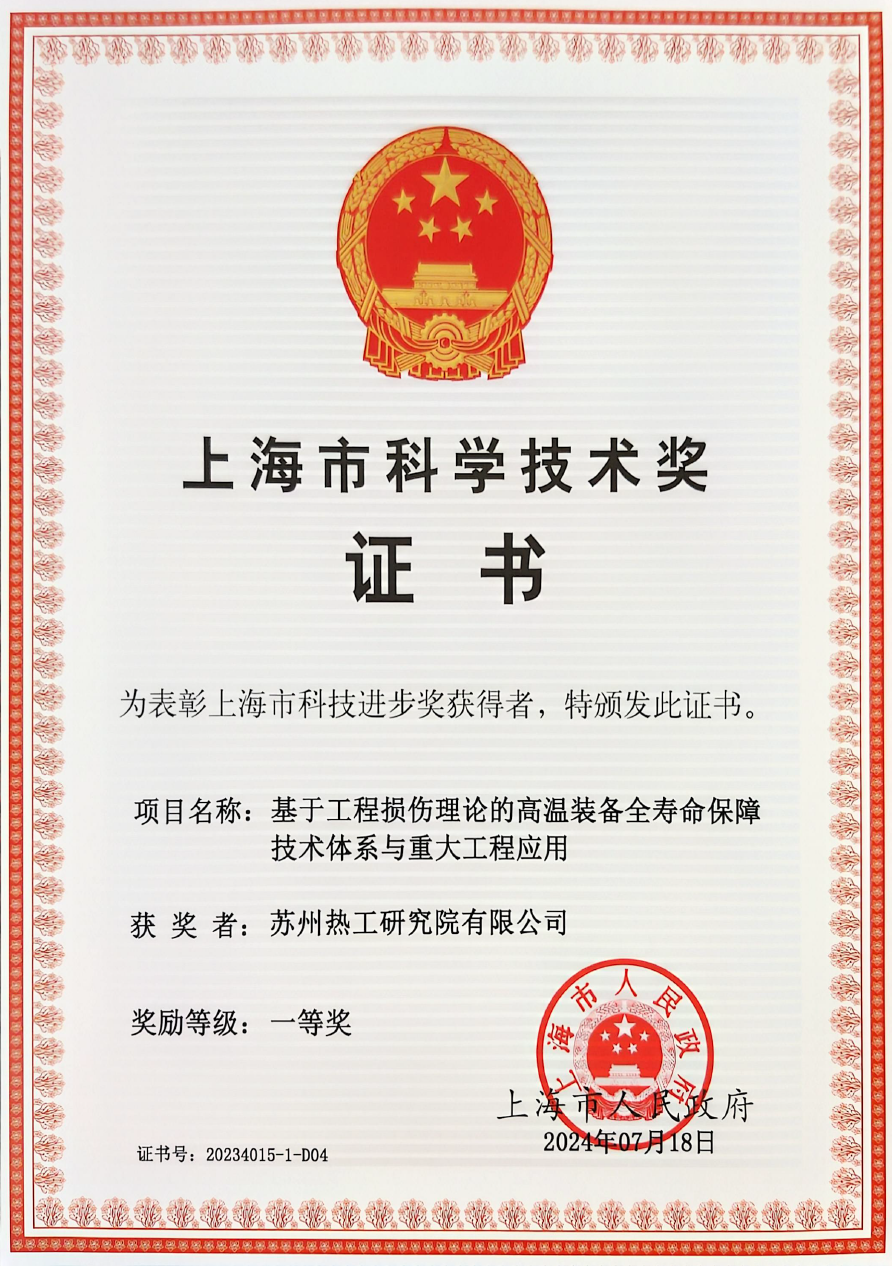 近日,上海市人民政府發(fā)布了《上海市人民政府關(guān)于2023年度上海市科學(xué)技術(shù)獎勵的決定》[滬府令8號]。蘇州熱工研究院有限公司聯(lián)合華東理工大學(xué)等單位申報的創(chuàng)新項目《基于工程損傷理論的高溫裝備全壽命保障技術(shù)體系與重大工程應(yīng)用》,榮獲上海市科技進(jìn)步一等獎。