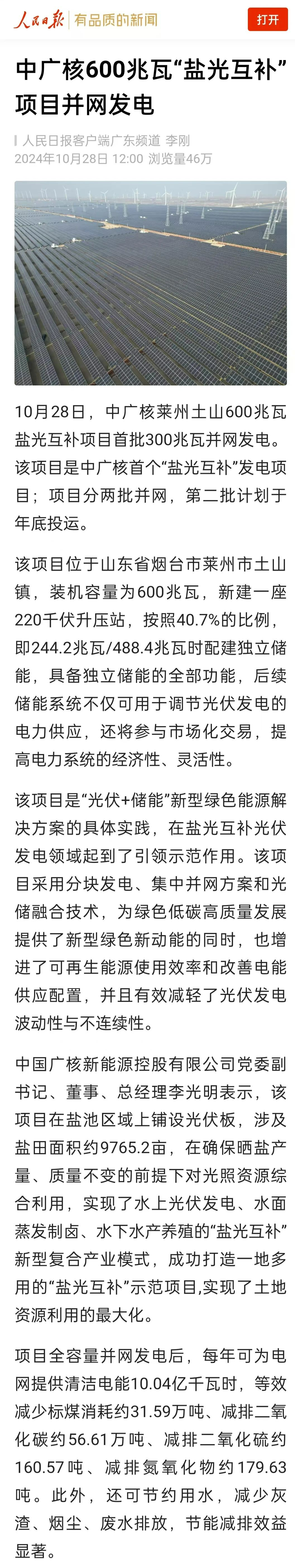 2024年10月28日,中國廣核集團萊州土山600兆瓦鹽光互補項目首批300兆瓦并網發電。該項目是山東省2022年市場化競配單體最大光伏項目、2024年山東省重大項目之一、山東省最大的配套儲能項目,也是中廣核首個“鹽光互補”發電項目,項目分兩批并網,第二批計劃于年底投運。