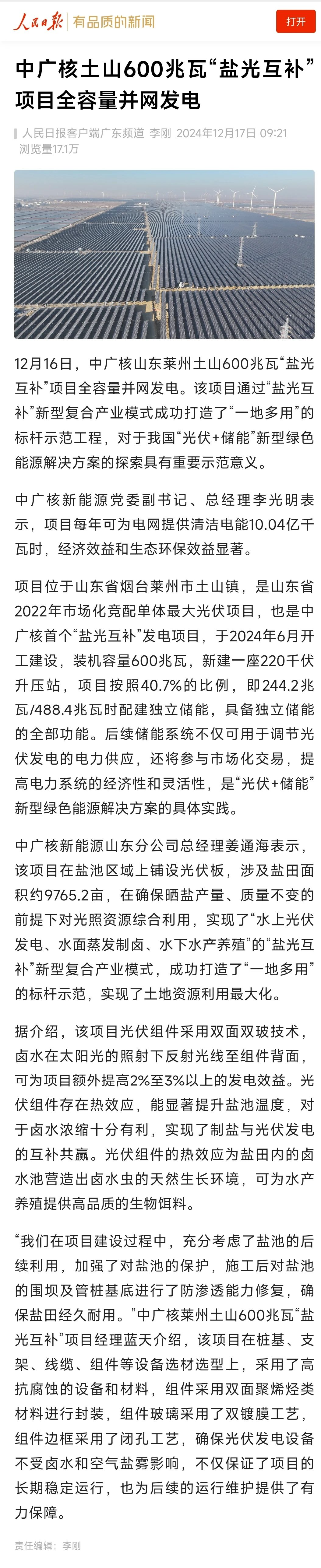 ▲人民日報報道中廣核首個“鹽光互補”項目全容量并網(wǎng)發(fā)電