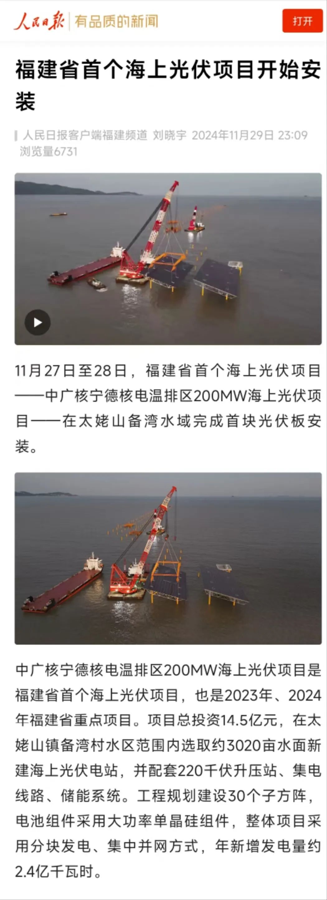 中廣核寧德核電溫排區(qū)200MW海上光伏項目是福建省首個海上光伏項目,也是2023年、2024年福建省重點項目。項目總投資14.5億元,在太姥山鎮(zhèn)備灣村水區(qū)范圍內(nèi)選取約3020畝水面新建海上光伏電站,并配套220千伏升壓站、集電線路、儲能系統(tǒng)。工程規(guī)劃建設(shè)30個子方陣,電池組件采用大功率單晶硅組件,整體項目采用分塊發(fā)電、集中并網(wǎng)方式,年新增發(fā)電量約2.4億千瓦時。