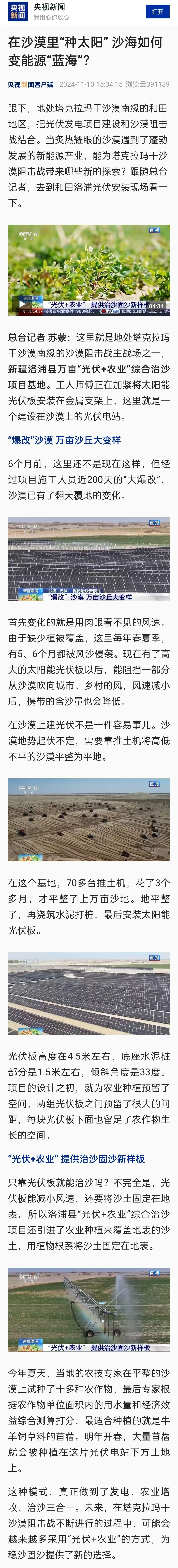 和田地區位于新疆維吾爾自治區最南端,總面積24.74萬平方公里,其中山地占33.3%,沙漠戈壁占63%,綠洲僅占3.7%,風沙常年困擾該地區。而如今,廣袤的沙漠邊緣,曾經的不毛之地呈現出一片生機勃勃的景象。光伏治沙項目的推進,不僅讓黃沙漫天的景象得到了有效遏制,更為農作物的種植開辟了新天地。